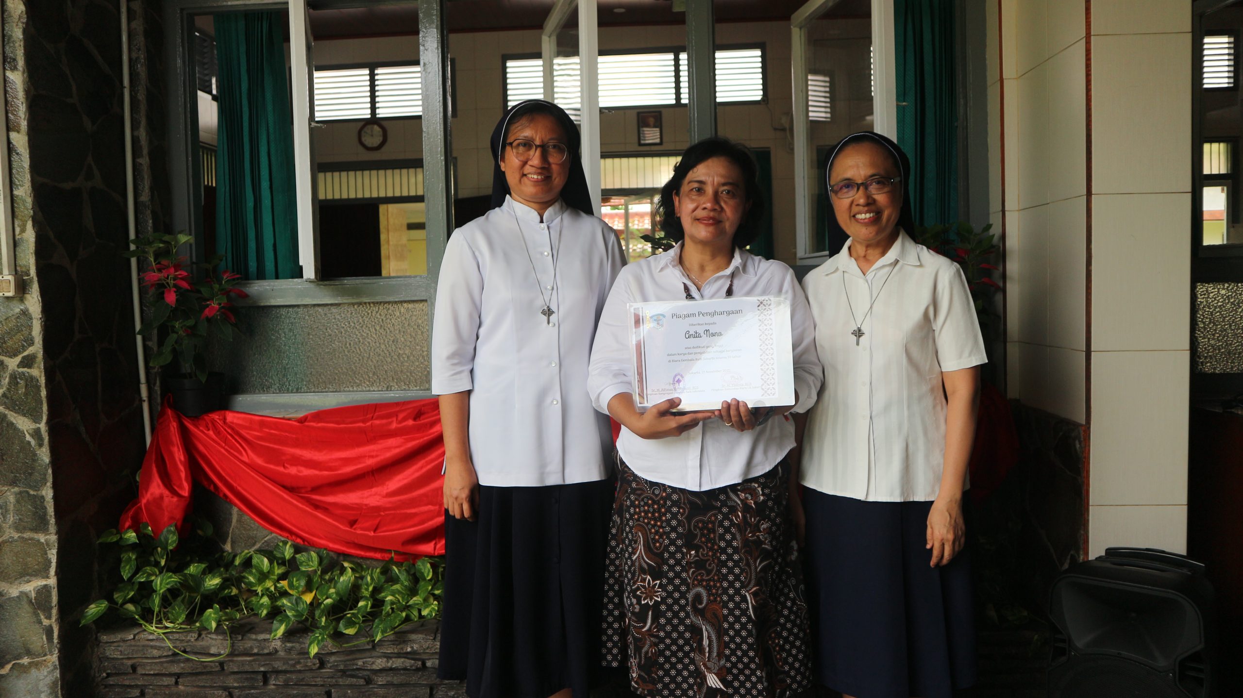 Sr. Alfonsa dan Sr. Theresia Anita bersama ibu Titik yang menerima piagam apresiasi atas pengabdiannya sebagai tenaga pendidik selama 30 tahun di SMP St. Maria Fatima Jakarta.